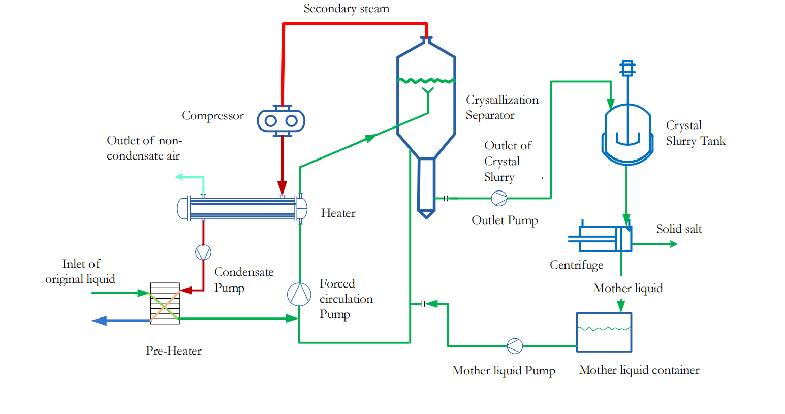 MVR蒸發(fā)器主要應(yīng)用于碳酸鋰/硫酸鋰/氫氧化鋰溶液的蒸發(fā)和結(jié)晶。 機(jī)械蒸汽再壓縮蒸發(fā)器(又稱MVR蒸發(fā)器)是一種比傳統(tǒng)多效蒸發(fā)系統(tǒng)更高效、節(jié)能、環(huán)保的蒸發(fā)技術(shù)。